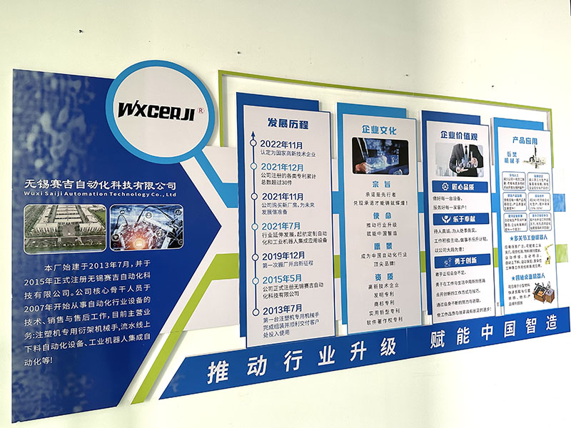 無錫賽吉自動化科技有限公司始建于2013年5月。公司幾位核心骨干人員在2007年到2009年分別入行從事注塑機(jī)專用機(jī)械手研發(fā)、設(shè)計(jì)、機(jī)電、組裝、銷售與售后工作,目前企業(yè)分別有三大塊經(jīng)營項(xiàng)目:自動化設(shè)備(數(shù)控車床、注塑機(jī)專用取件機(jī)械手為主)設(shè)計(jì)、生產(chǎn)、銷售與服務(wù)。